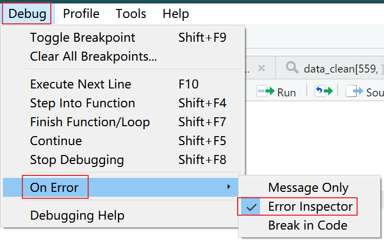 Error才会触发 Rstudio 的自动呈现trackback()信息功能(详见15.3.1.2); - 只有使用 Source 进入 debug 模式才会激活 Rstudio 的 debug toolbar(详见15.4)。