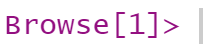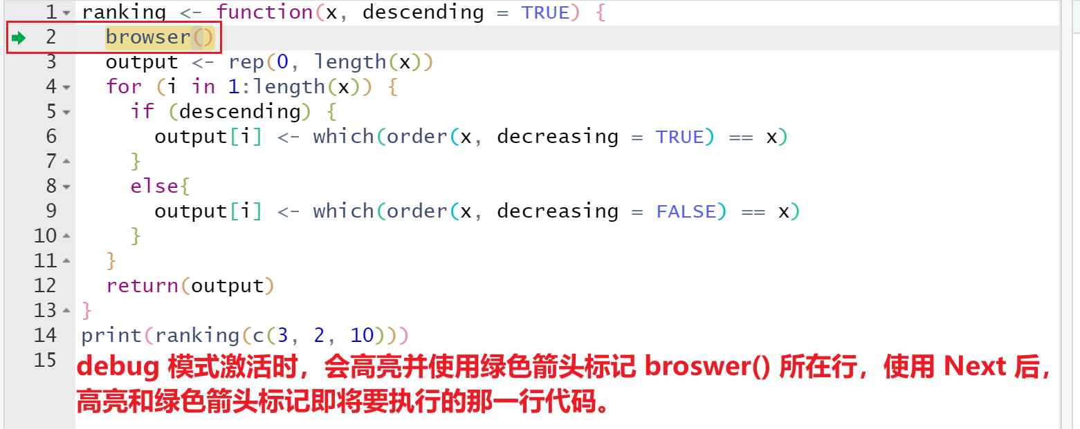 其中绿色箭头和高亮表示 R 停在了这一行,这一行还未执行(browser()行除外,因为使用browser()进入 debug 模式时,意味着browser()这一行已经被执行了)。