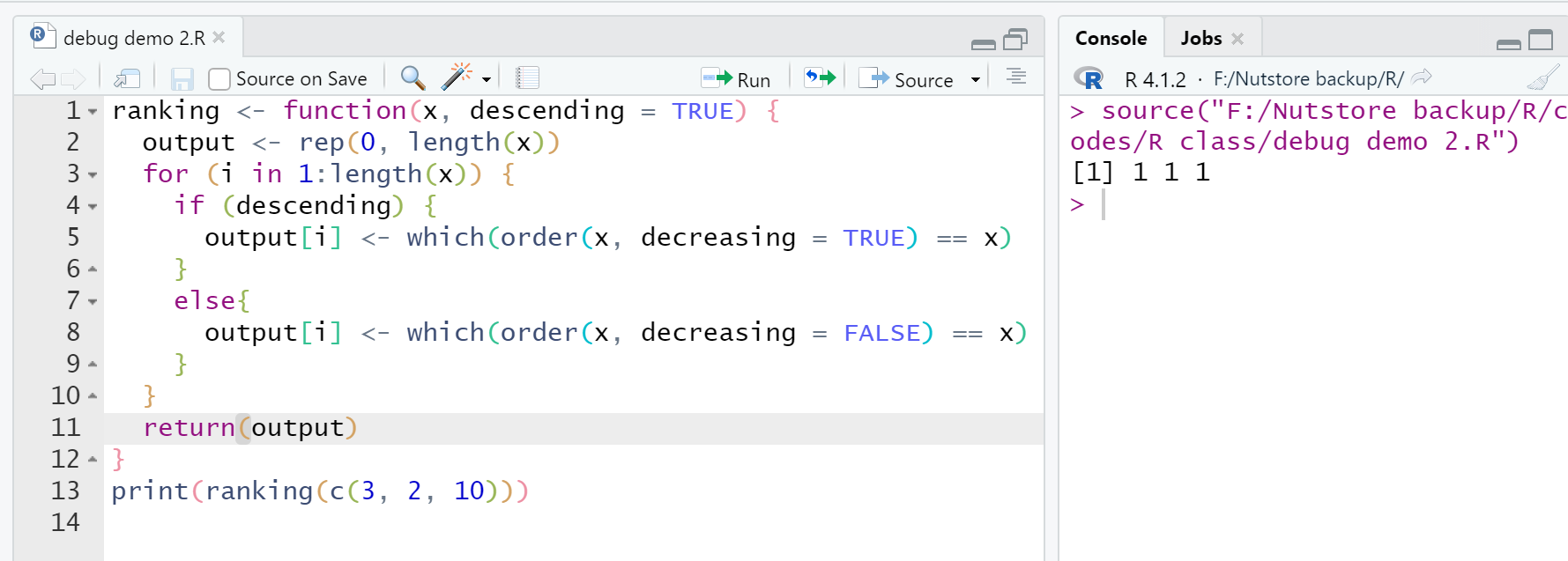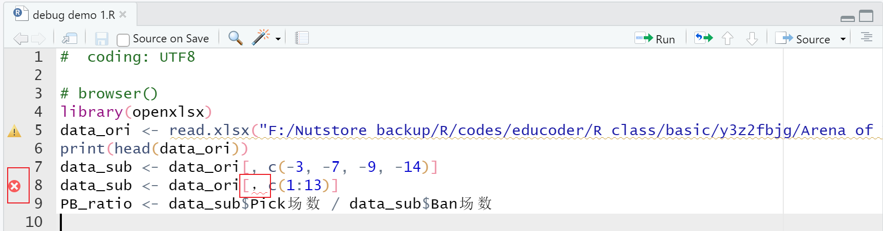 当代码中存在 bug 时,不论是显性 bug 还是隐性 bug,debug 时都需要在出错的地方停下来。更准确地说,应该是让 R 运行完 bug 所在行代码的上一行就要停下来,这样就可以查看在 bug 发生的前一刻到底发生了什么,才能最终找到问题的根源。
