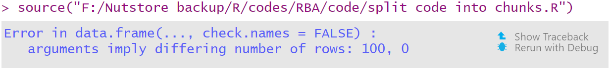 在使用 Source 的方式运行代码后(debug 的第一步),如果是显性 bug,R 会自动终止运行的代码,相当于自动完成了 debug 的第二步—— bug 所在行因为有 bug 所以没有运行成功,而此行之前的所有代码都顺利运行了,本质上就是在 bug 发生前夕停了下来。就只剩下第三步了——找到问题的根源。