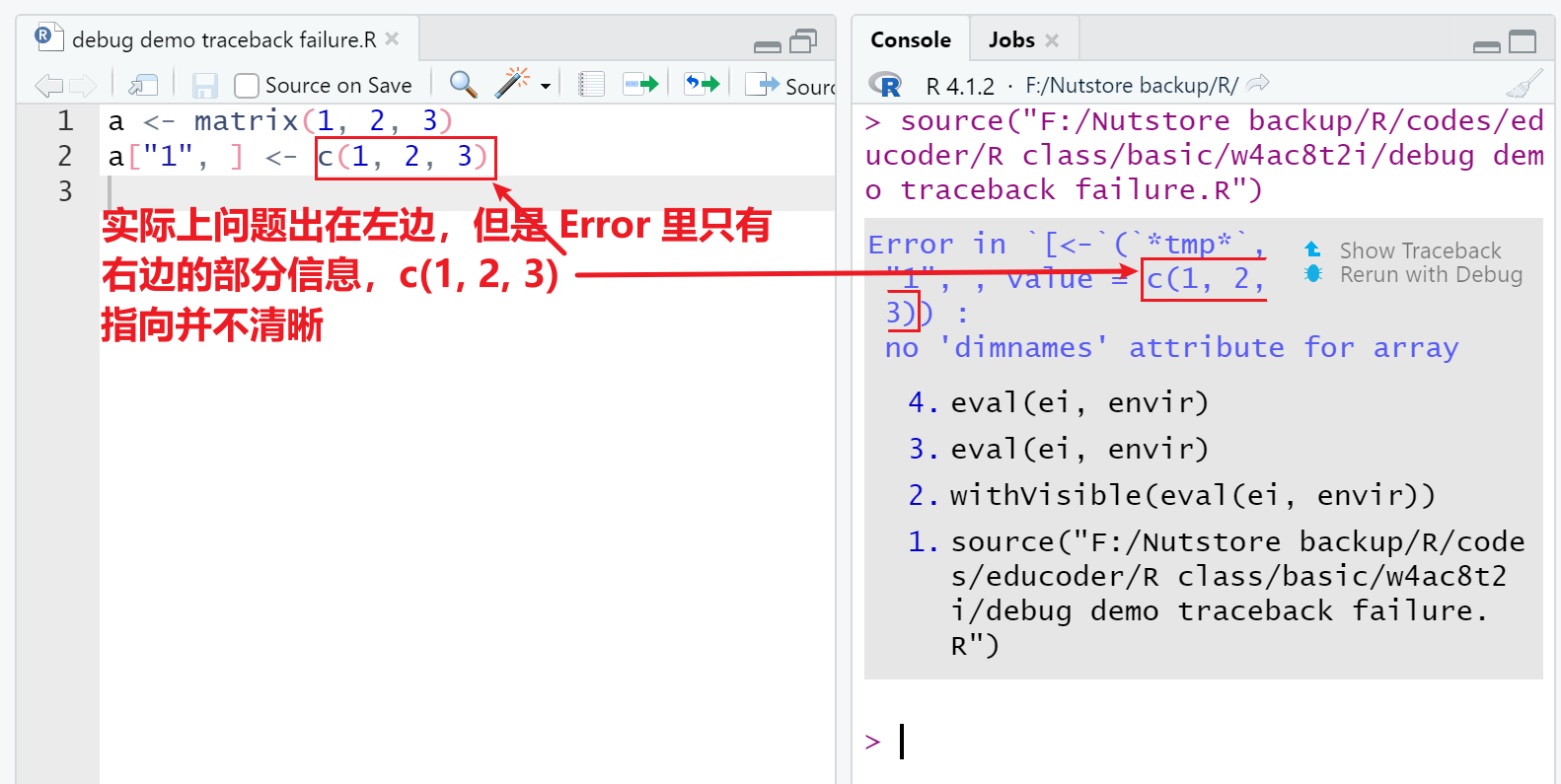 traceback()会将运行代码直到Error出现的所有中间过程都记录下来,包括 R 在执行代码时的一些内部函数(internal function),所以查看的时候只需要关注包含自己代码的部分即可(进入 debug 模式后 Rstudio 提供的 traceback 信息会自动略掉 internal functions);