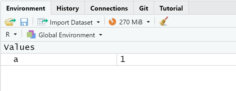 例如,执行a <- 1,产生了一个叫a的object,它的value是1,在 Global Environment 中显示如下: