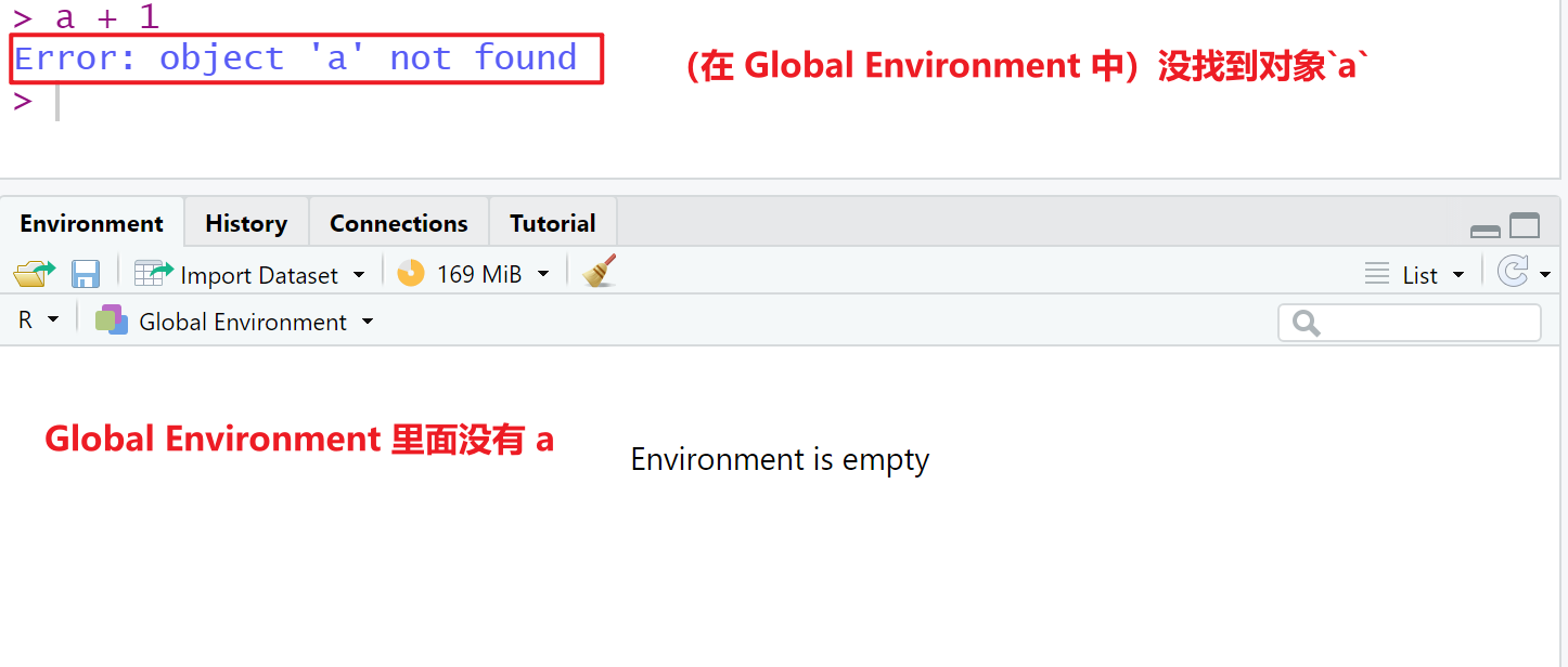 相反,如果事先没有通过a <- 1的方式生成a,直接执行a + 1就会报错, R 会告诉你“不好意思,我找不到a,这事我干不了”:
