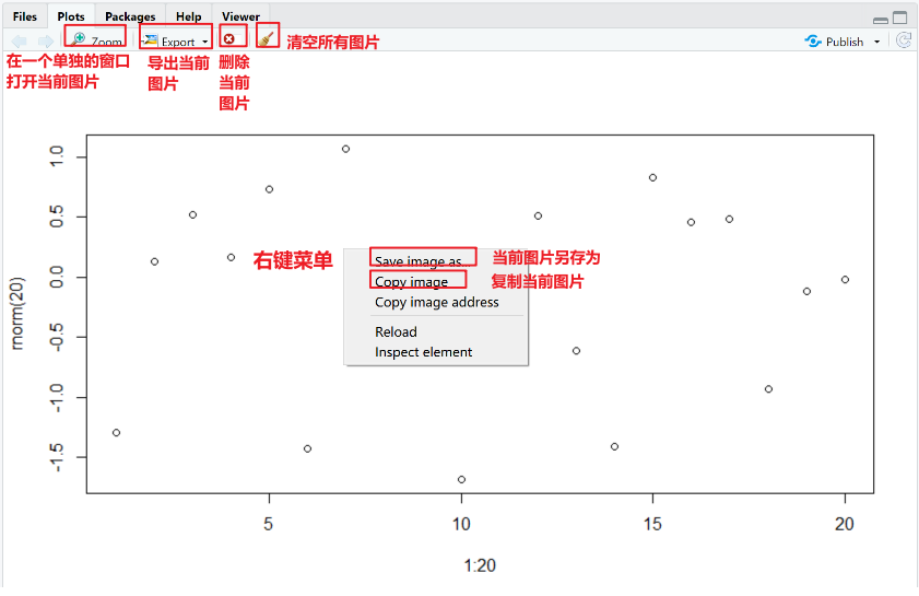 在 R 中,使用代码画出来的图都会以图片的方式呈现在 Plots 标签页中。Plots 标签页中也集成了一些基本的操作按钮,并且可以通过在图片上右键的方式呼出右键菜单来执行一些额外的简单操作。例如画一个散点图,在 Console 中输入plot(x = 1:20, y = rnorm(20)),Plots 标签页的内容如下: