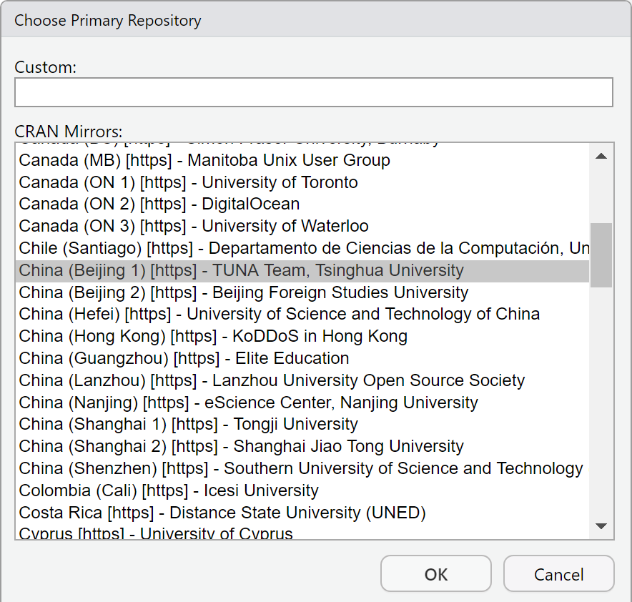 - packages -> Change -> 在 CRAN mirrors 一栏中选以 China 开头的国内镜像 -> OK