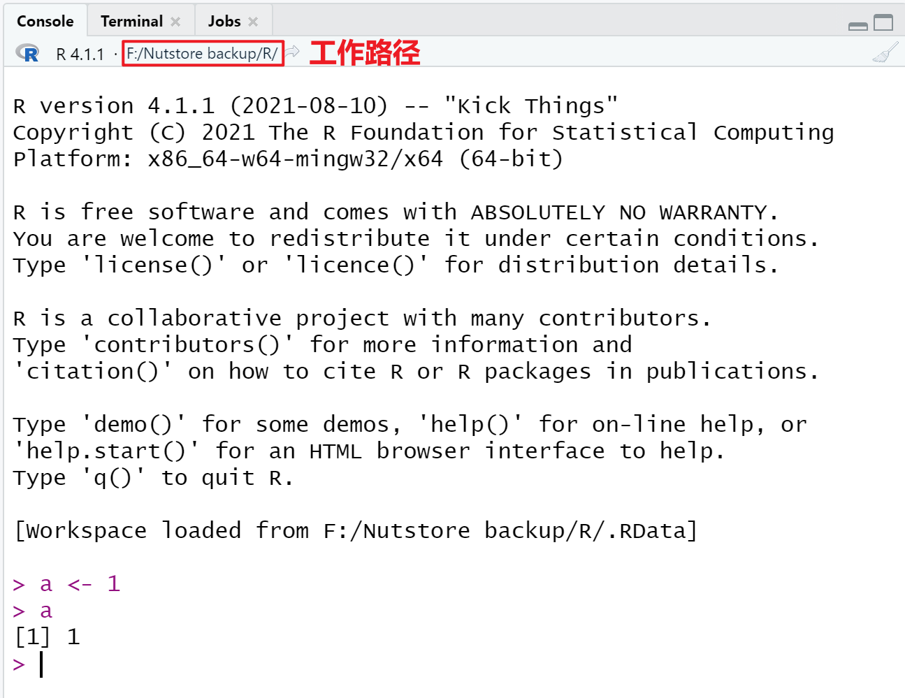 在 R 中,Console 是用来执行代码并输出结果的地方,可以视作是一个交互式的命令行窗口。例如,在 Console 输入两行代码,分别是a <- 1(无输出结果)和a(输出a的value,即1),如下图所示: