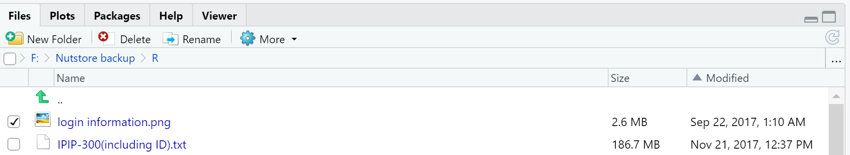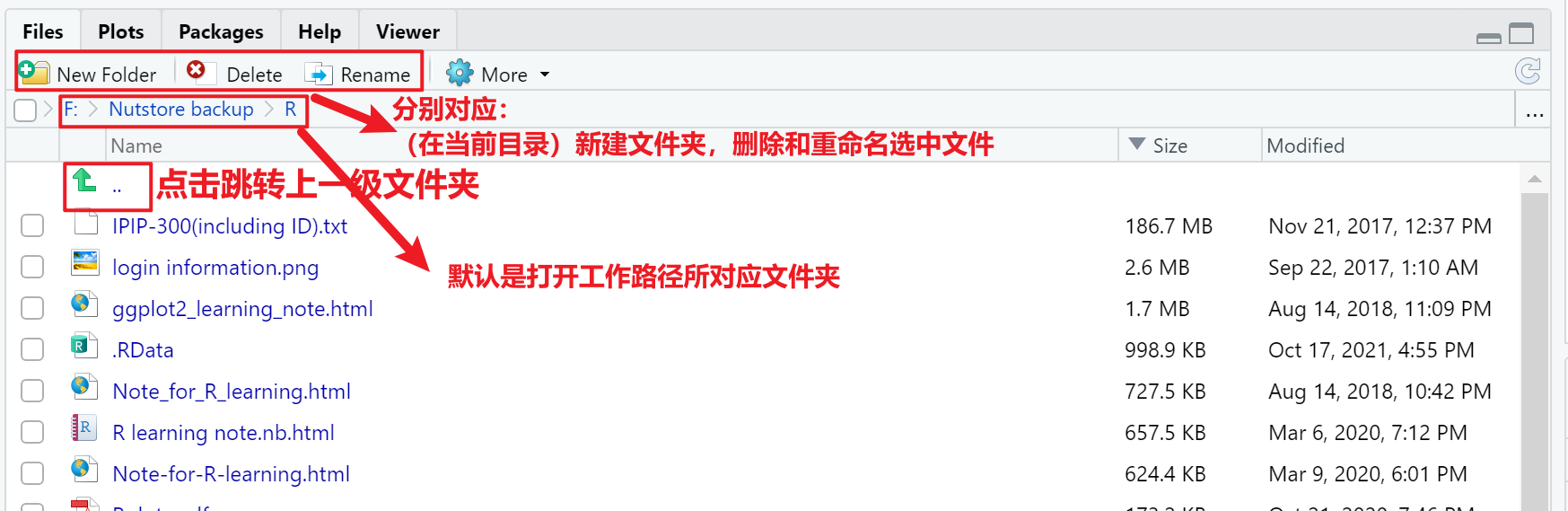 Files 标签页就是 RStudio 中的简版 Windows 资源管理器。如下图所示, RStudio 已经将常见的一些文件操作集成为按钮,如 New Folder,Delete,Rename等: