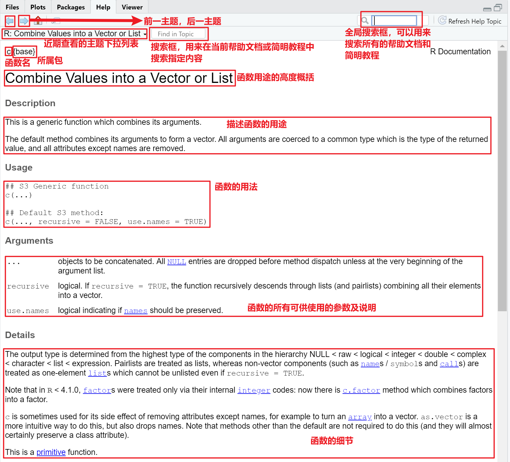 以查看c()的帮助文档为例,执行?c后, RStudio 会自动将c()的帮助文档呈现在 Help 标签页,如下图所示: