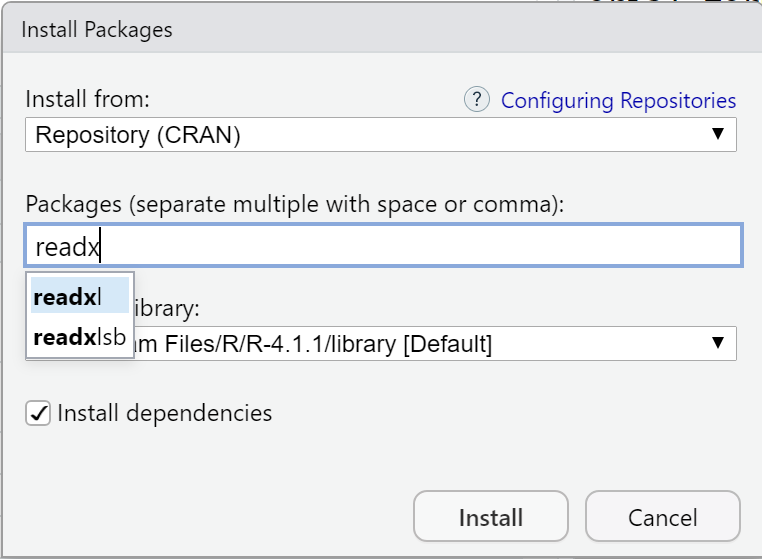 - 在 Packages 一栏中键入 readxl,在输入的过程中, RStudio 会从服务器端检索匹配输入内容的 package 列表,当输入到 readx 时,目标 package 就已经出现在列表中,选择即可。