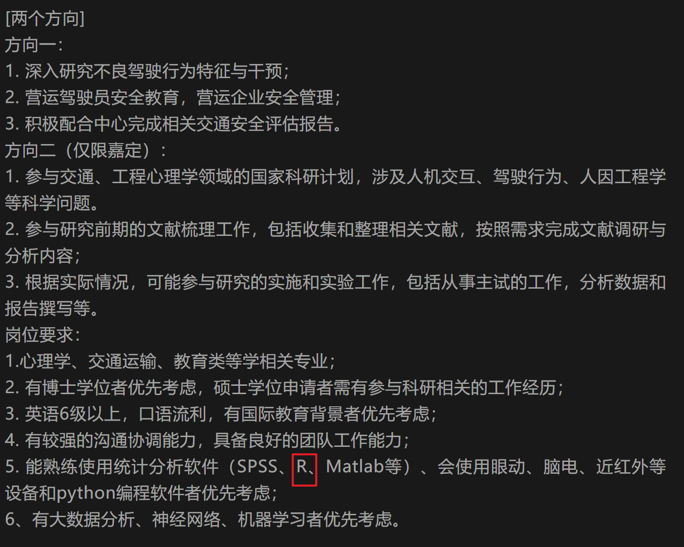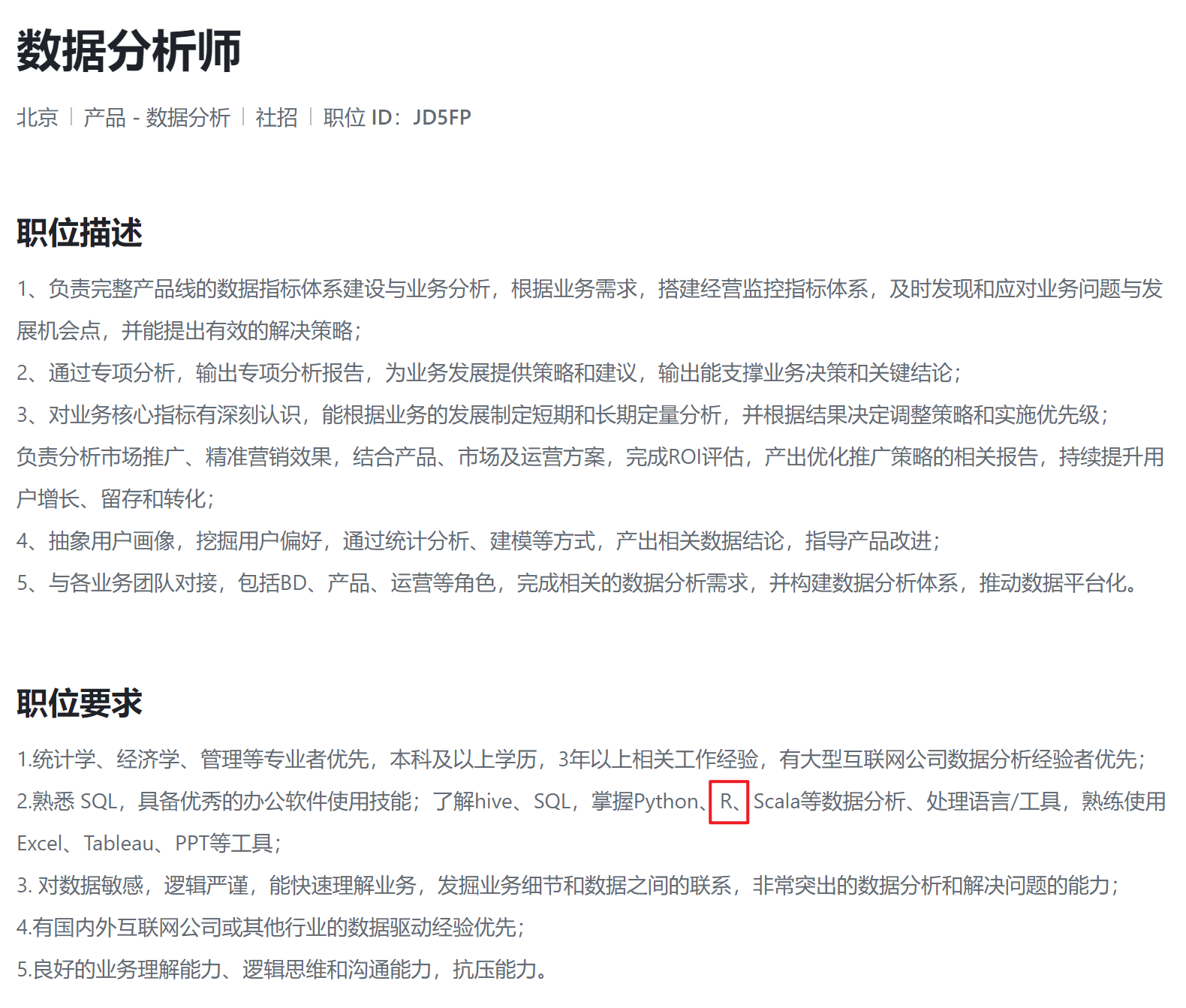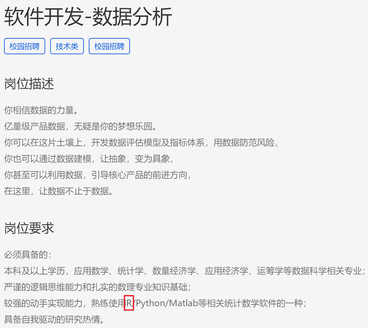 理由:R 在业界和学界都有广泛的运用,对于未来打算从事任何与数据的分析和处理有关的岗位, 学习和掌握 R 都是一个不错的选择,可以成为你的武器库中的一把趁手的兵器。