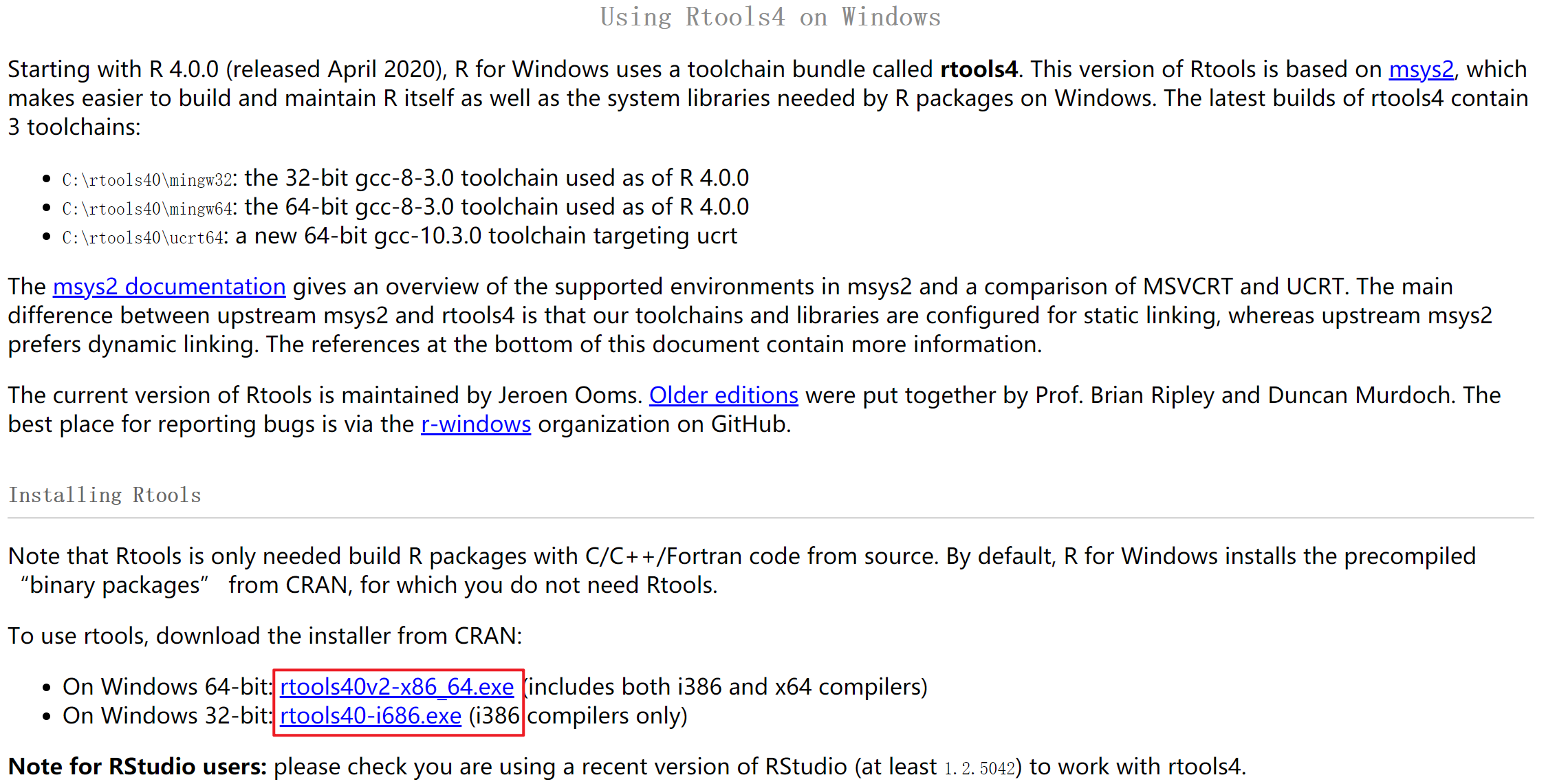 当碰到诸如创建 R 包、下载一些尚处在开发阶段的 R 包等情况时,会要求使用者的电脑安装了 Rtools。