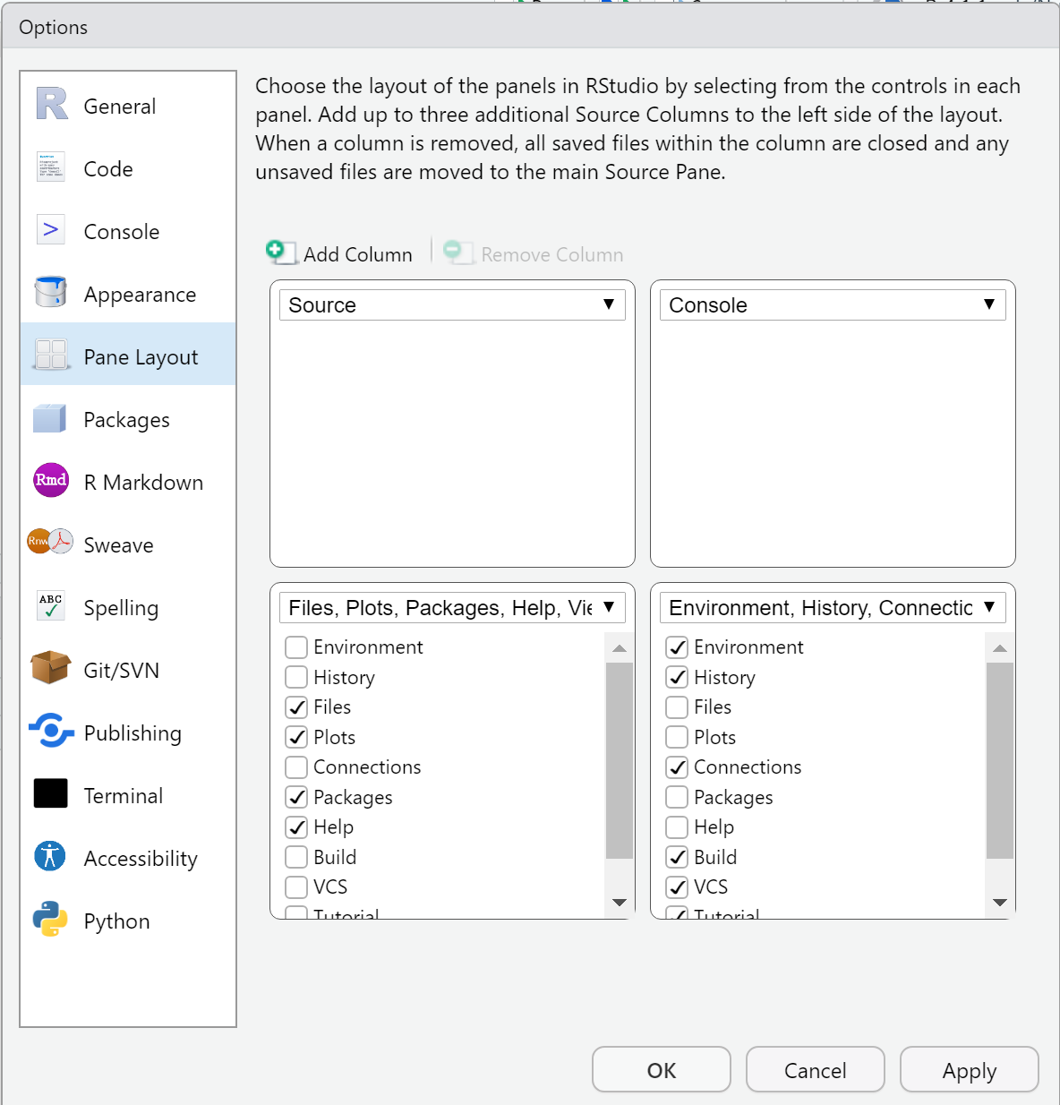 如果要更改各版块的位置和版块内呈现的具体内容,使用 Rstudio的顶部菜单中的”View”,具体为:View->Panes->Pane Layout