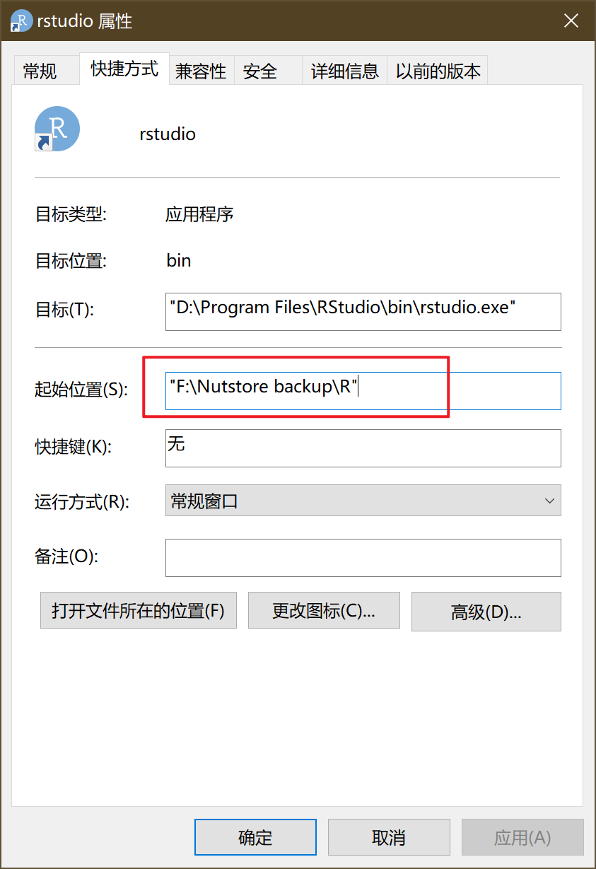 - 在该快捷方式上右键->属性->起始位置->粘贴复制的路径到引号内