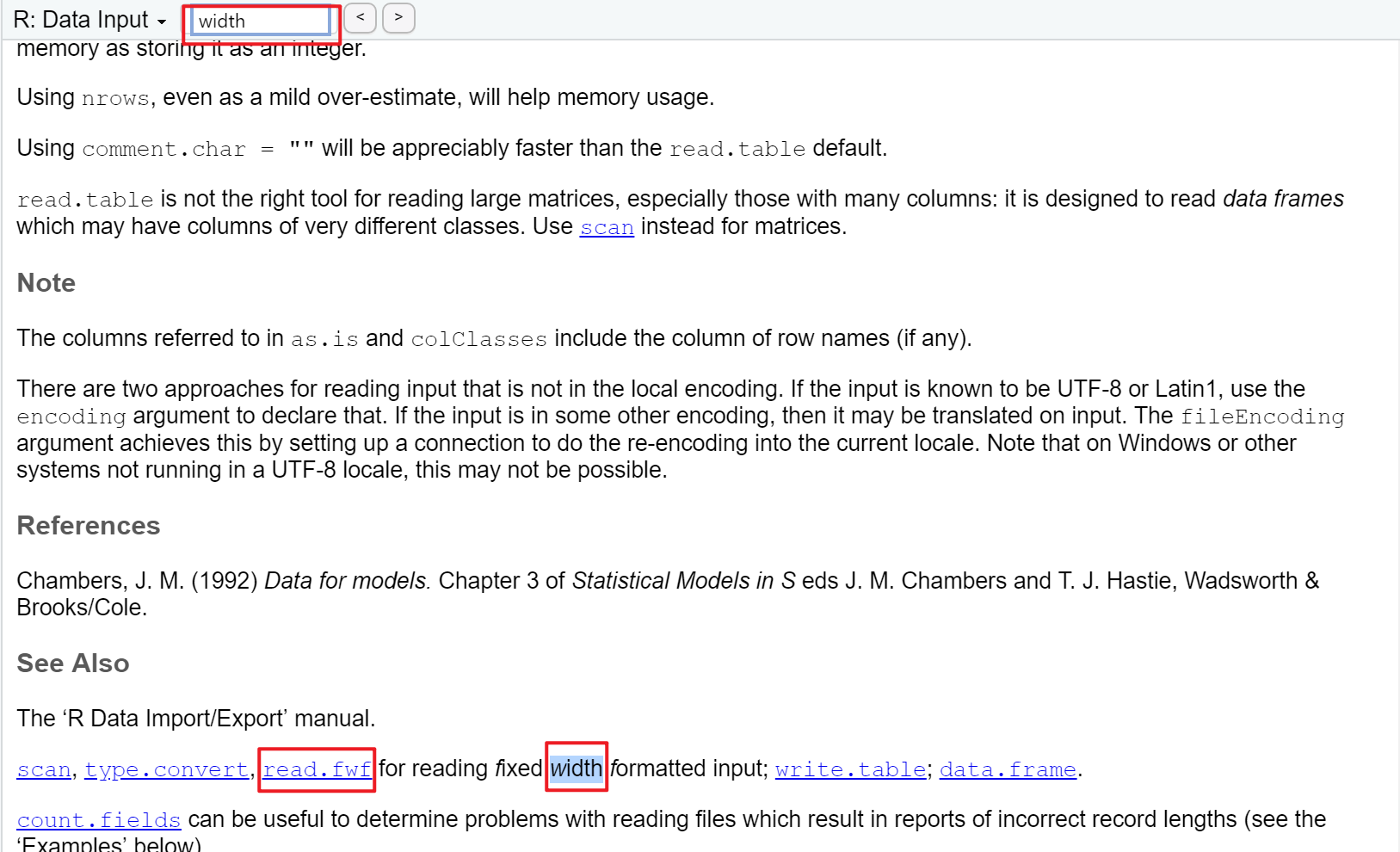read.table()的帮助文档里面搜素一下,有没有和宽度(width)相关的内容,只有一处,提到了read.fwf(),如下图所示:
