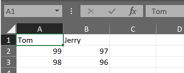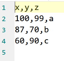 由于 .csv 是纯文本文档,所以读取和写入速度要比 .xlsx 文档更快,通常会将 .xlsx 文件通过另存为的方式转存成 .csv 文件再处理。下面是读取 .csv 文档示例,数据和上面 .xlsx 的例子是一样的,代码如下: