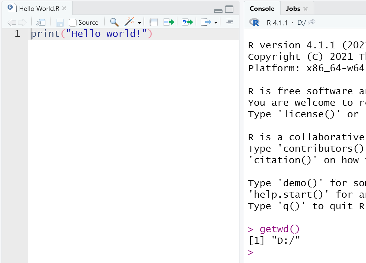 - xxx.R。在没有打开 Rstudio 和 R 的情况下,通过双击 xxx.R 的方式打开 Rstudio 时,会将该脚本所在文件目录作为默认 working directory,例如在 D 盘的根目录下有一个 R 的脚本 Hello World.R,双击后会自动打开 Rstudio,此时的 Working directory 就是
