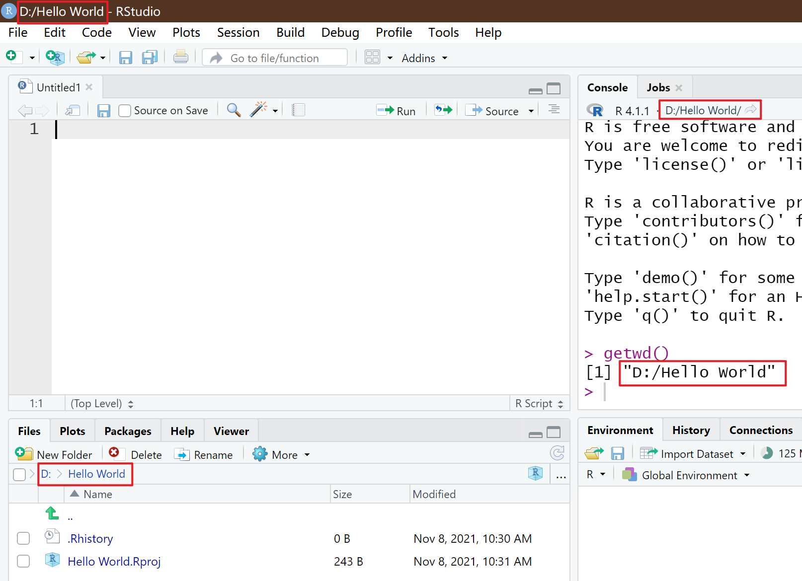 - xxx.Rproj(推荐)。通过双击 xxx.Rproj 的方式打开 Rstudio,会默认将该 .Rproj 文件所在文件目录作为默认 working directory,xxx.Rproj 对应一个 project,例如在 D:/Hello World 文件夹下创建一个 project,Rstudio 就会自动创建一个 Hello World.Rproj,双击该文件会自动打开 Rstudio