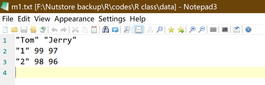 read.table(file = "data/m1.txt") # the missing part will be automatically supplied by R using working directory